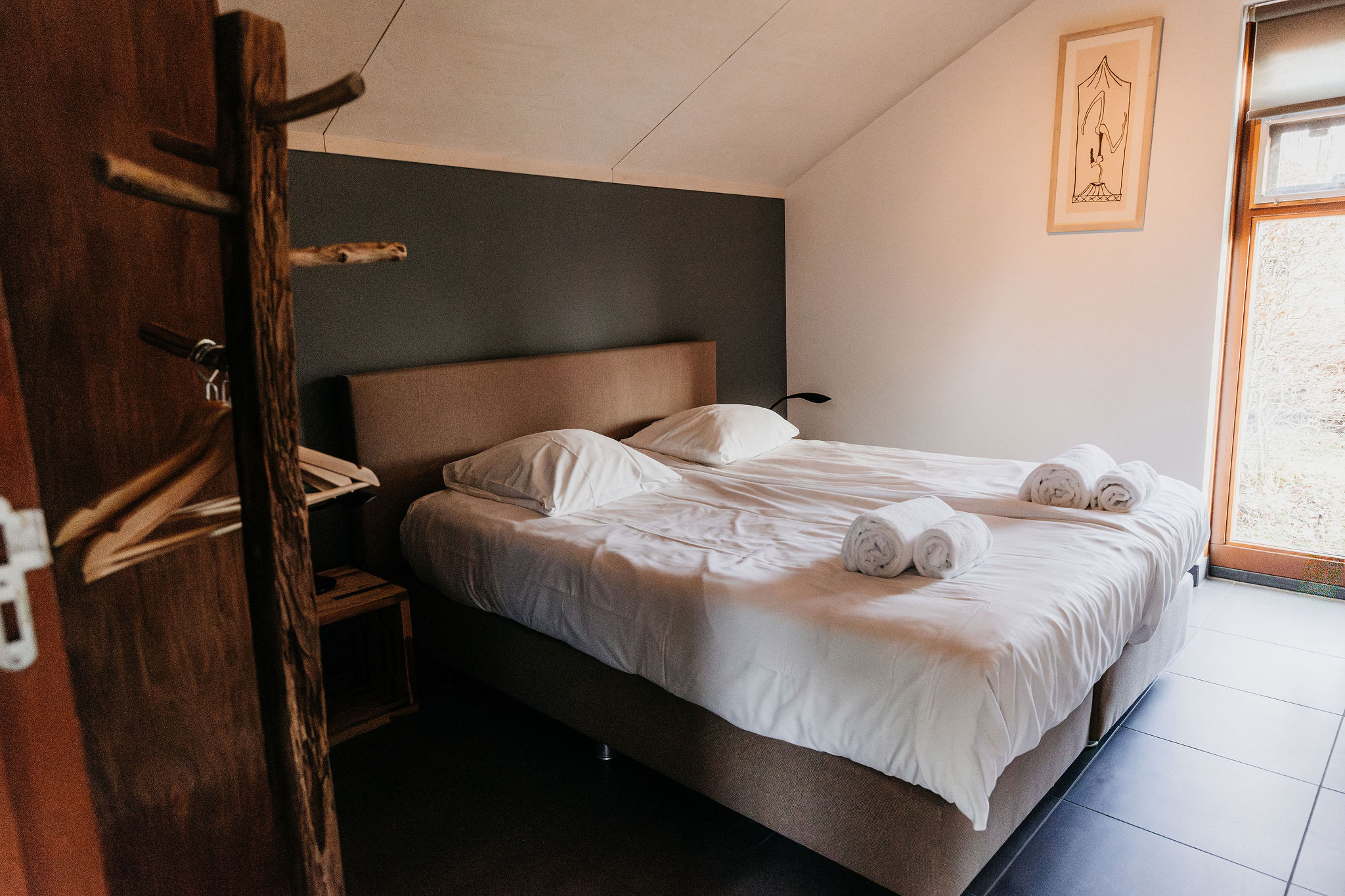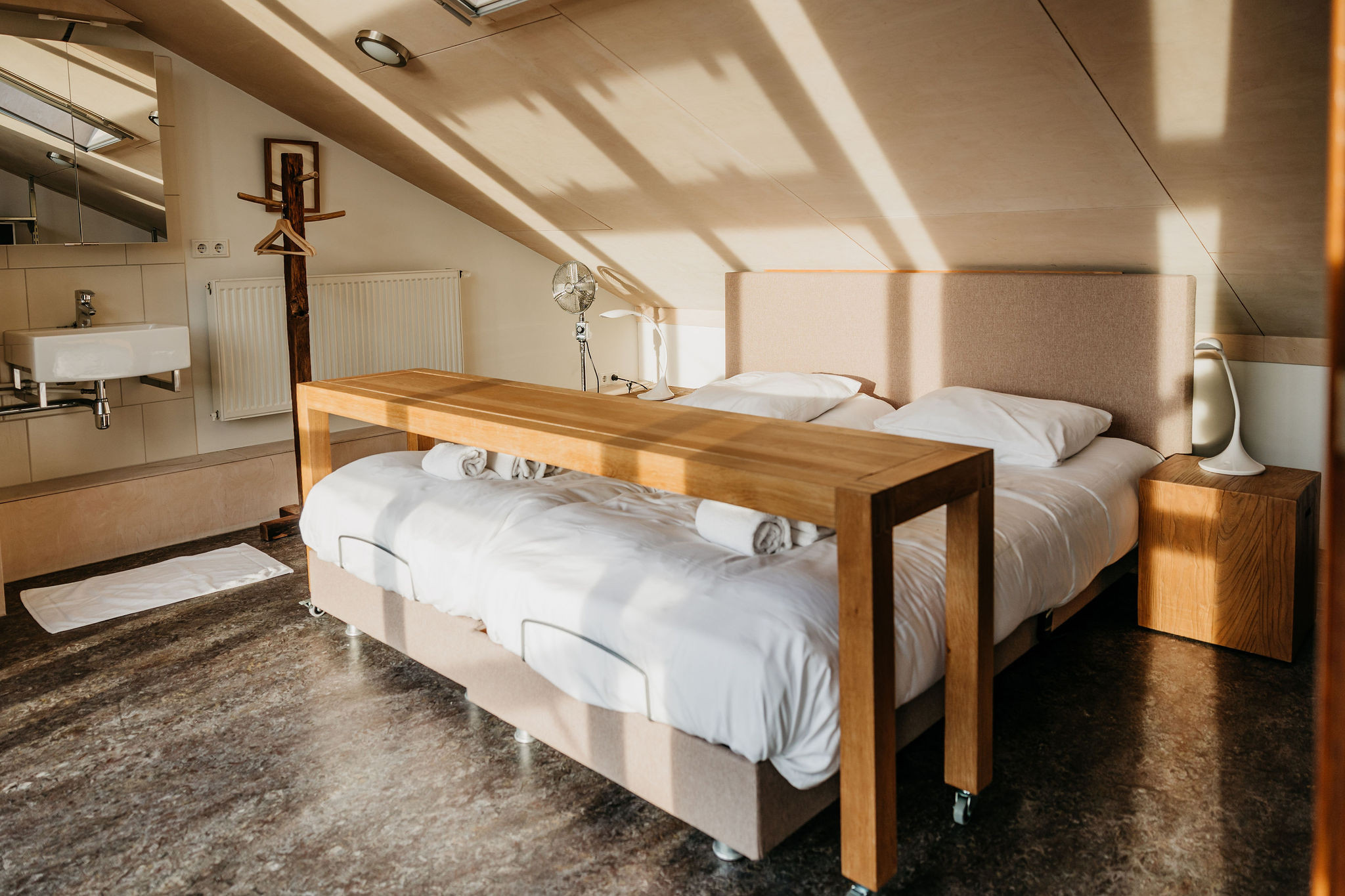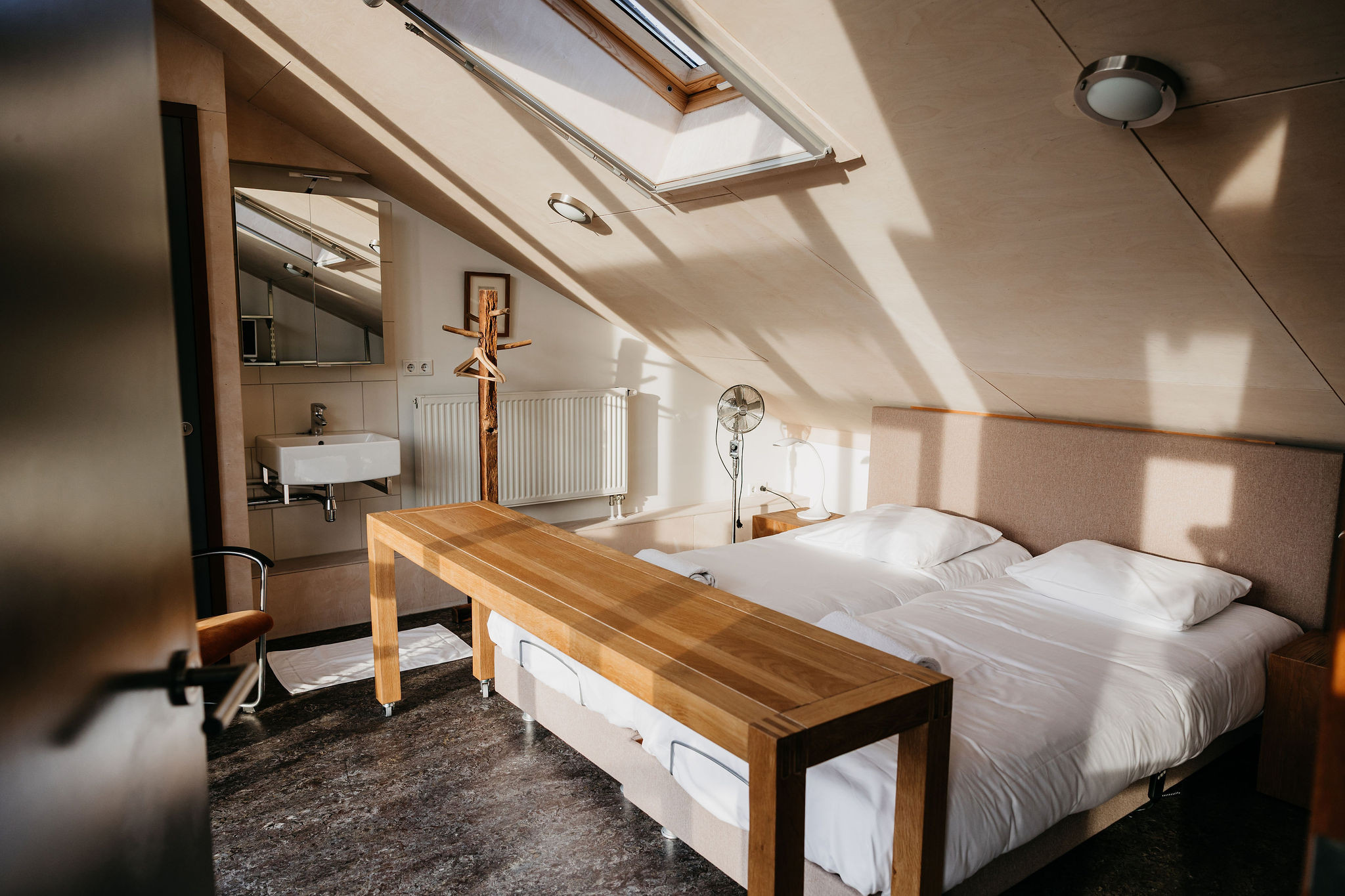 Op de bovenverdieping is een ruime slaapkamer met twee extra lange boxspringbedden, een wastafel en televisie. De woning beschikt over gratis WiFi.