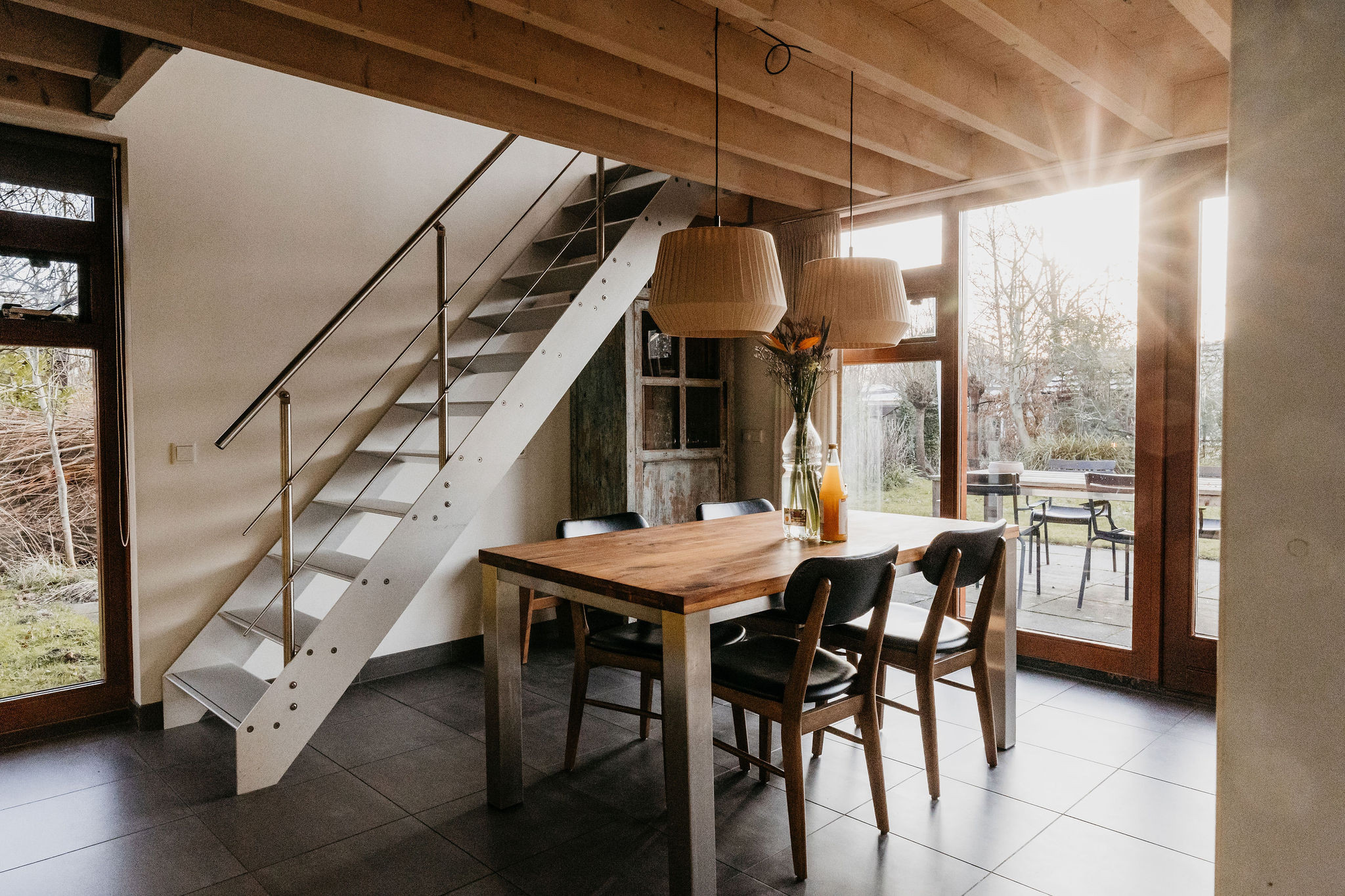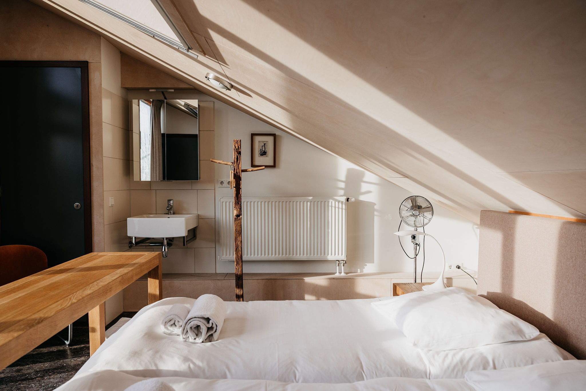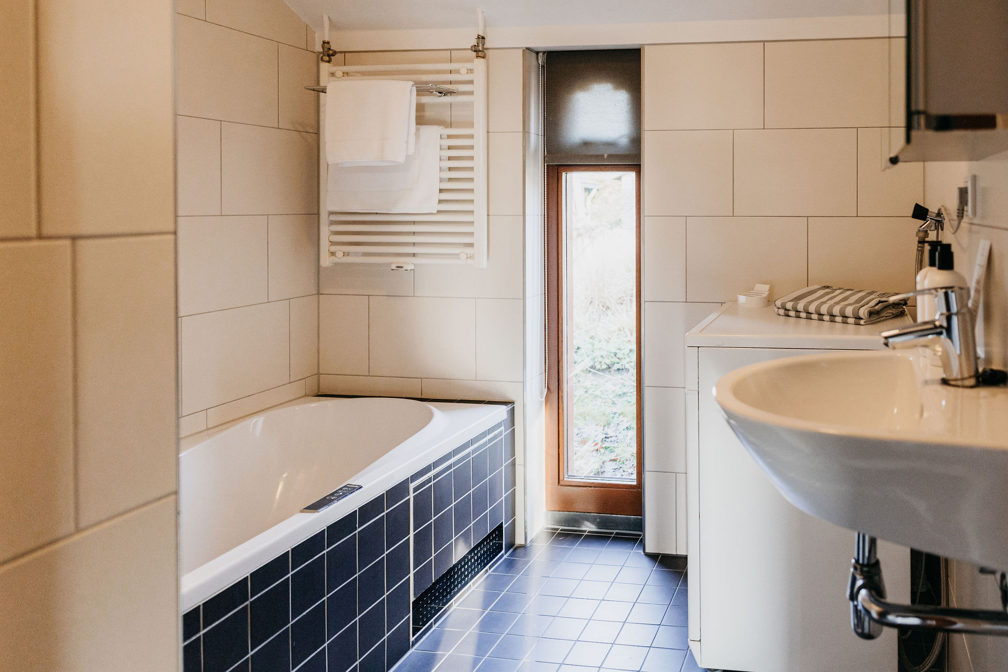 Op de bovenverdieping is een ruime slaapkamer met twee extra lange boxspringbedden, een wastafel en televisie. De woning beschikt over gratis WiFi.