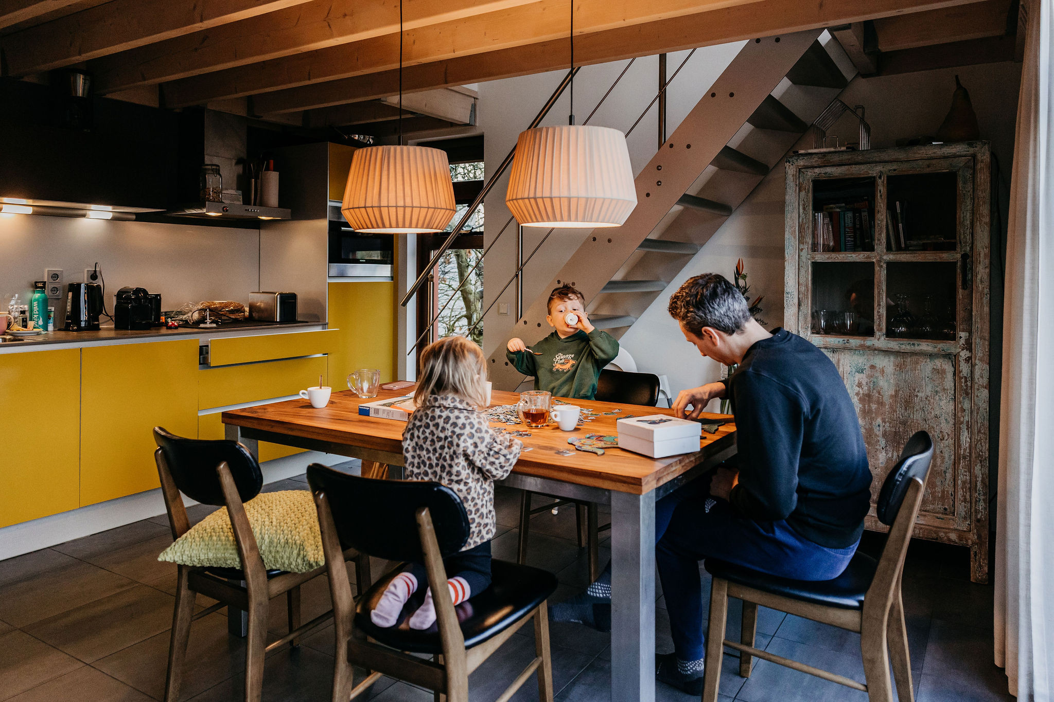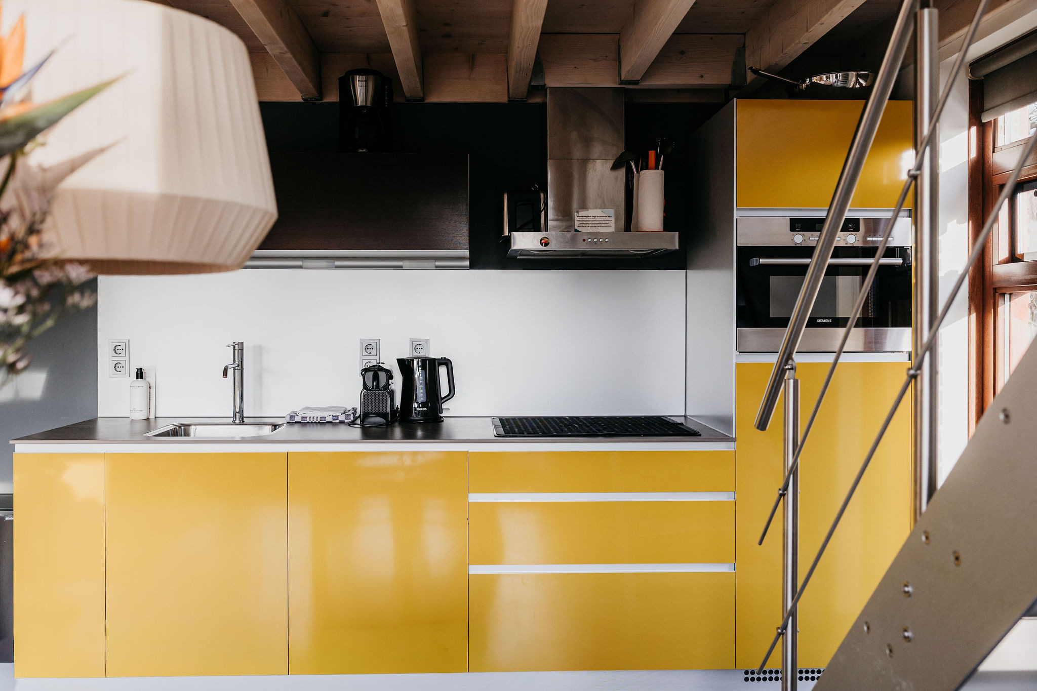 De Italiaanse designkeuken is van alle gemakken voorzien met onder andere een inductiekookplaat, een vaatwasser, combimagnetron en Nespresso-apparaat. In de keuken is een elektrische fondueset en een uitgebreide pannenset met luxe wok- en braadpan aanwezig.