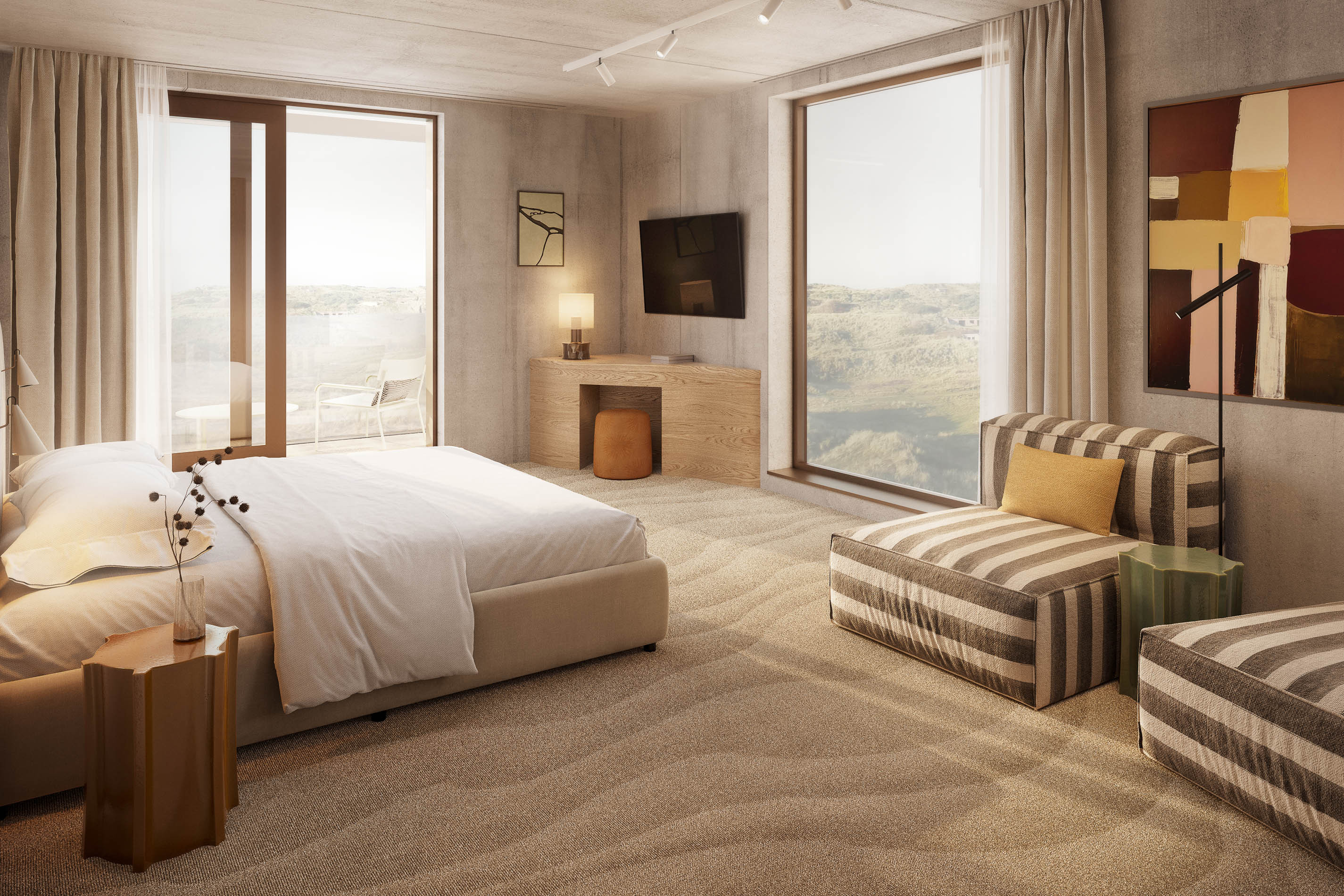 Elke kamer beschikt bovendien over een eigen balkon met een stijlvol zitje. Het is de perfecte plek om de eerste zonnestralen te vangen met een kop koffie of de dag af te sluiten terwijl de zon langzaam in de zee zakt – een ervaring die de magie van Terschelling nog intenser maakt.