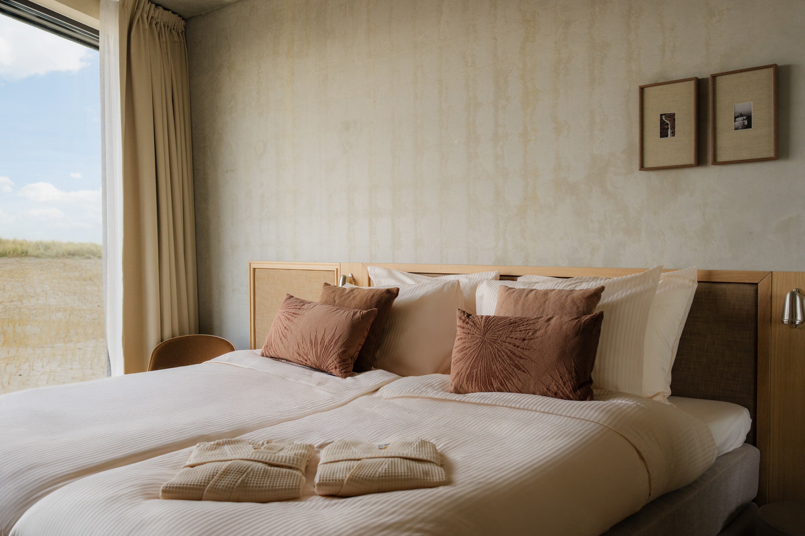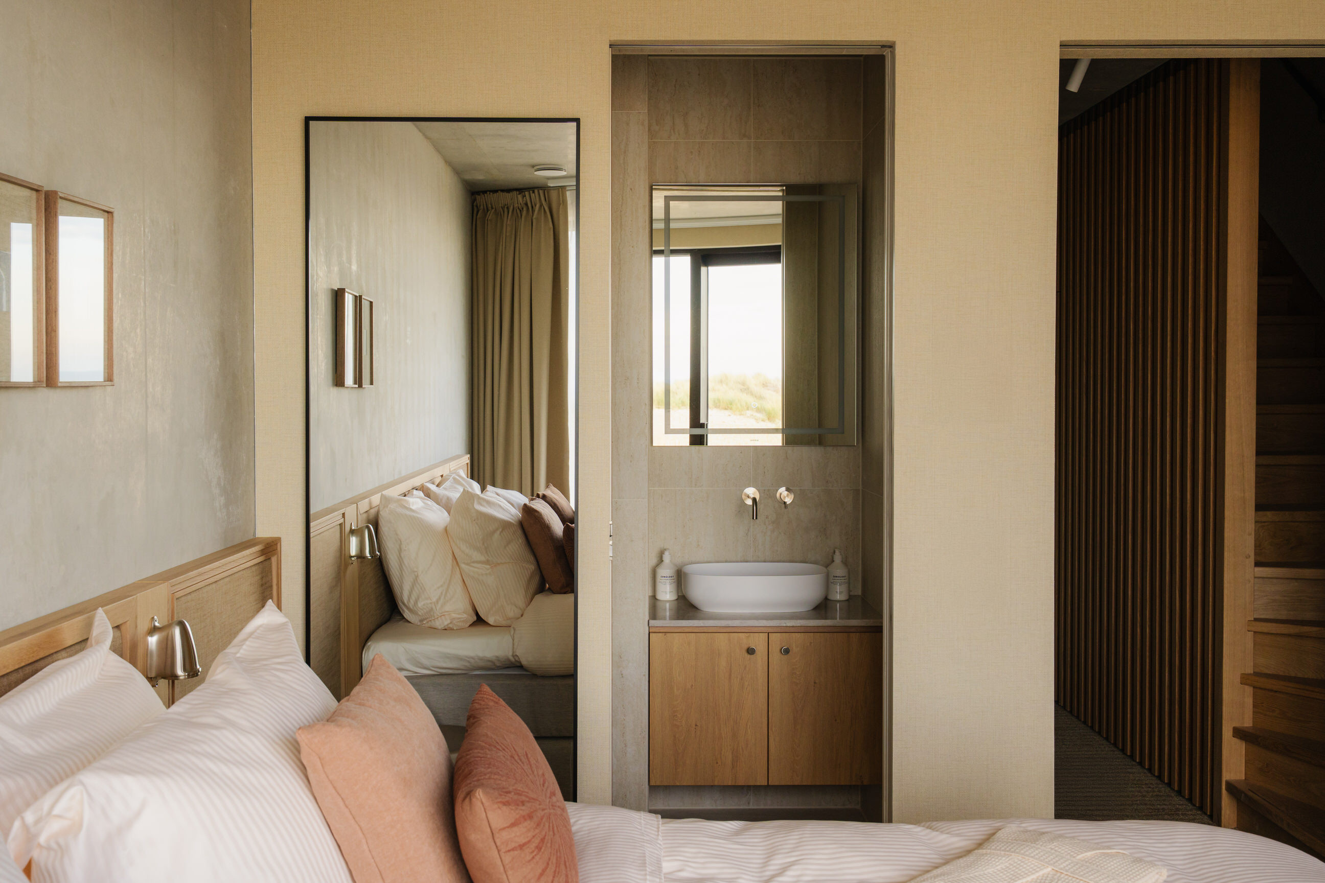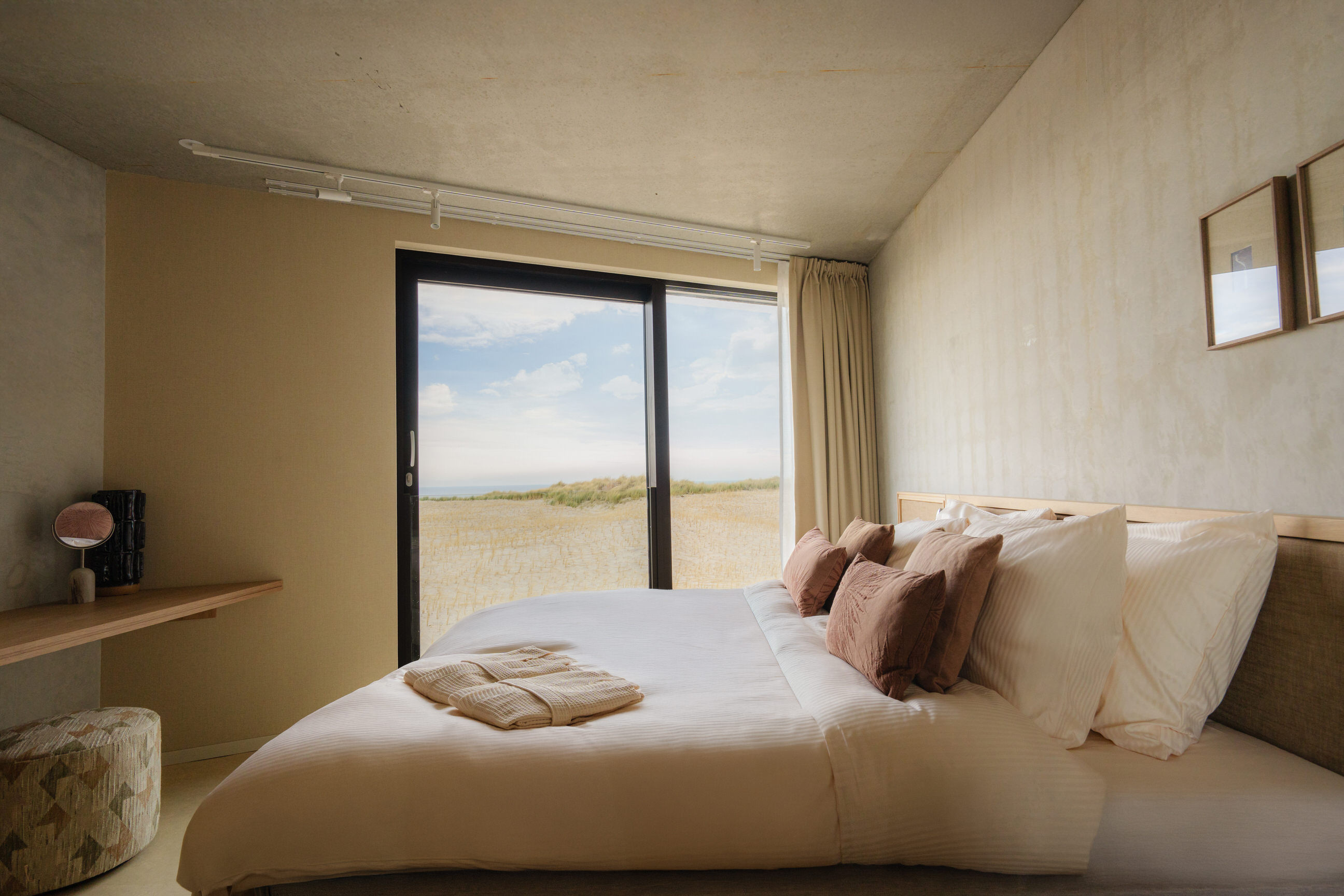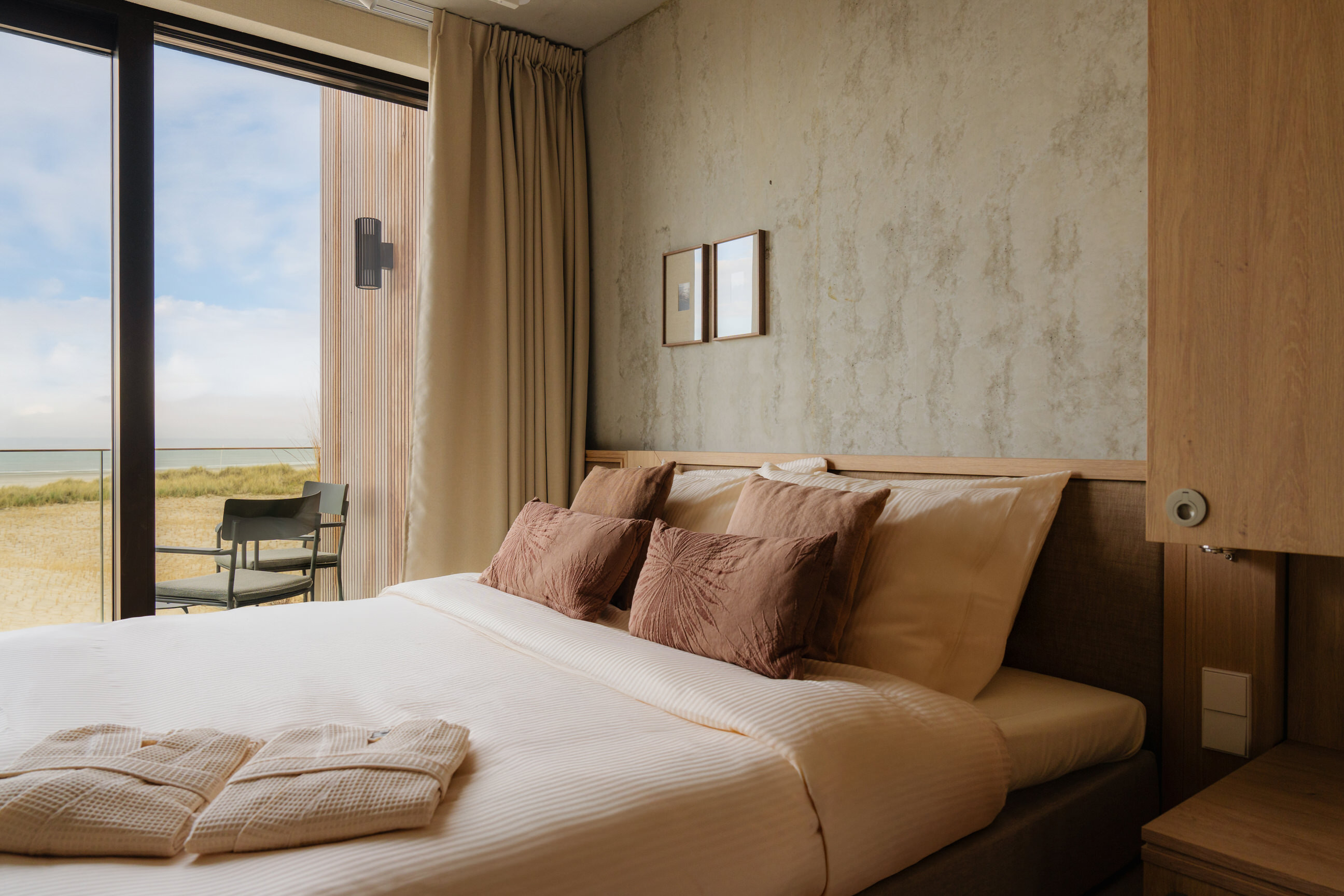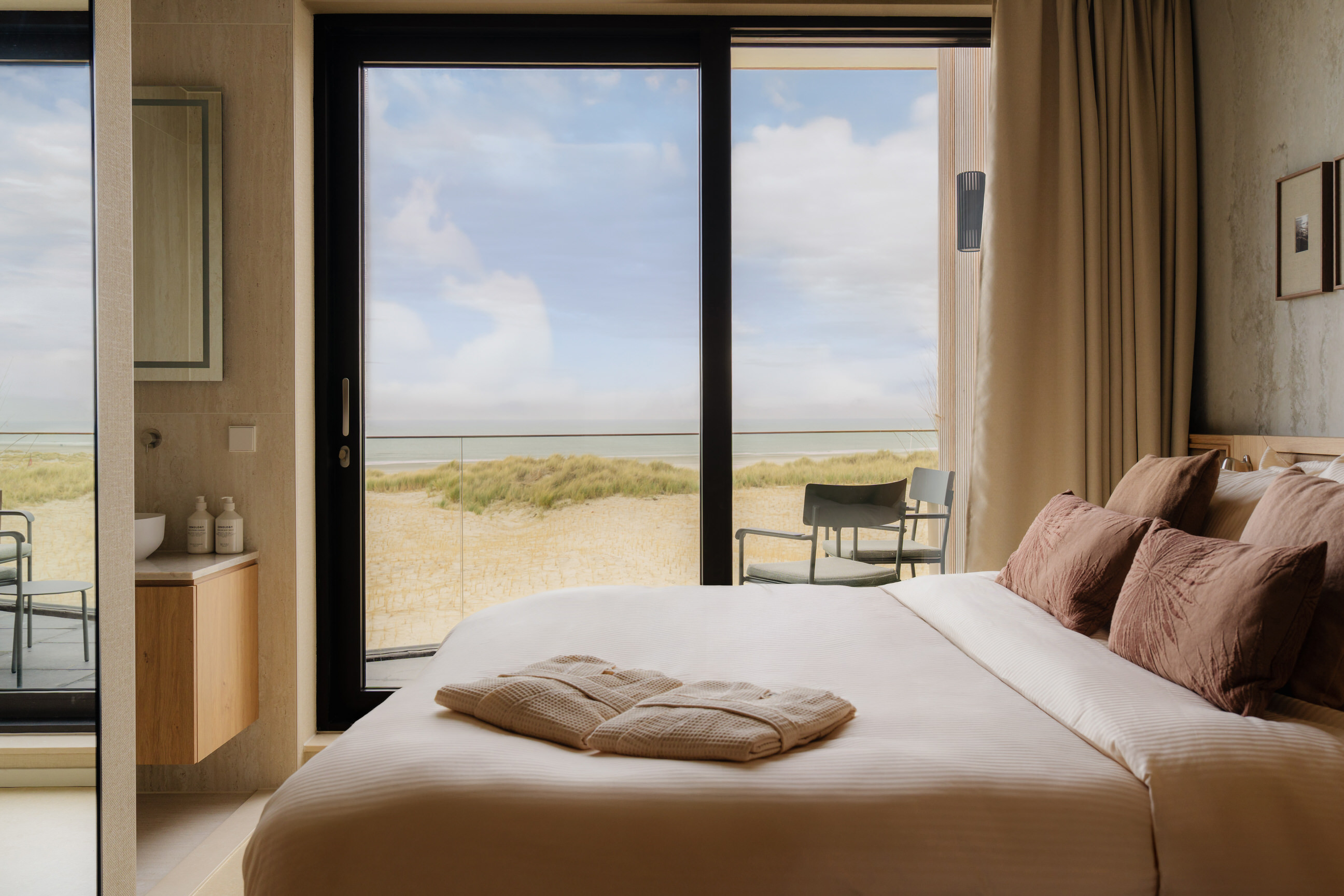 Dit luxe duplex appartement van 70 m², gelegen op de tweede en derde etage, biedt een fenomenaal uitzicht over bos, duin en zee. Met twee elegante slaapkamers, elk uitgerust met een luxe boxspringbed en hoogwaardig bedlinnen, ervaar je hier ultiem comfort. Beide slaapkamers beschikken over een eigen ensuite badkamer met inloop-regendouche, exclusieve Zenology® verzorgingsproducten, zachte handdoeken, badjassen, slippers en een haardroger.
