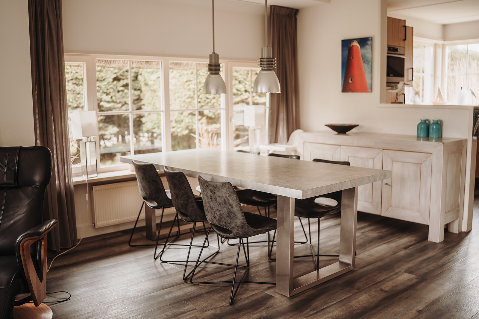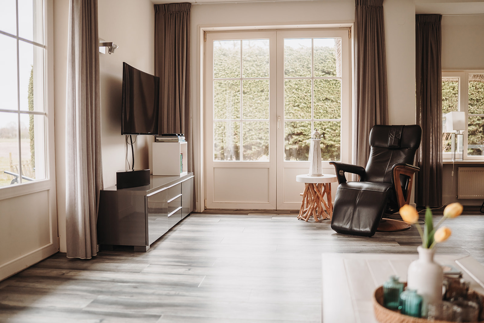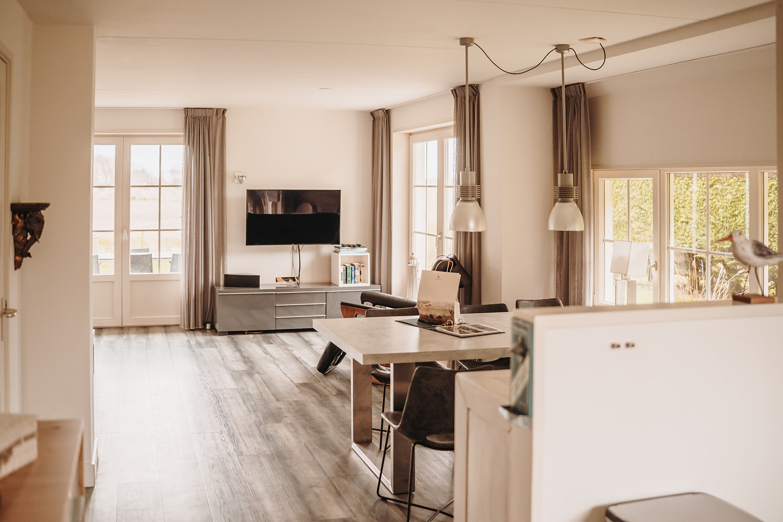 Vanuit de lichte en sfeervolle woonkamer met ruime loungebank heb je een prachtig uitzicht over de landerijen van Texel. Via de openslaande deuren kom je op het terras en in de tuin.