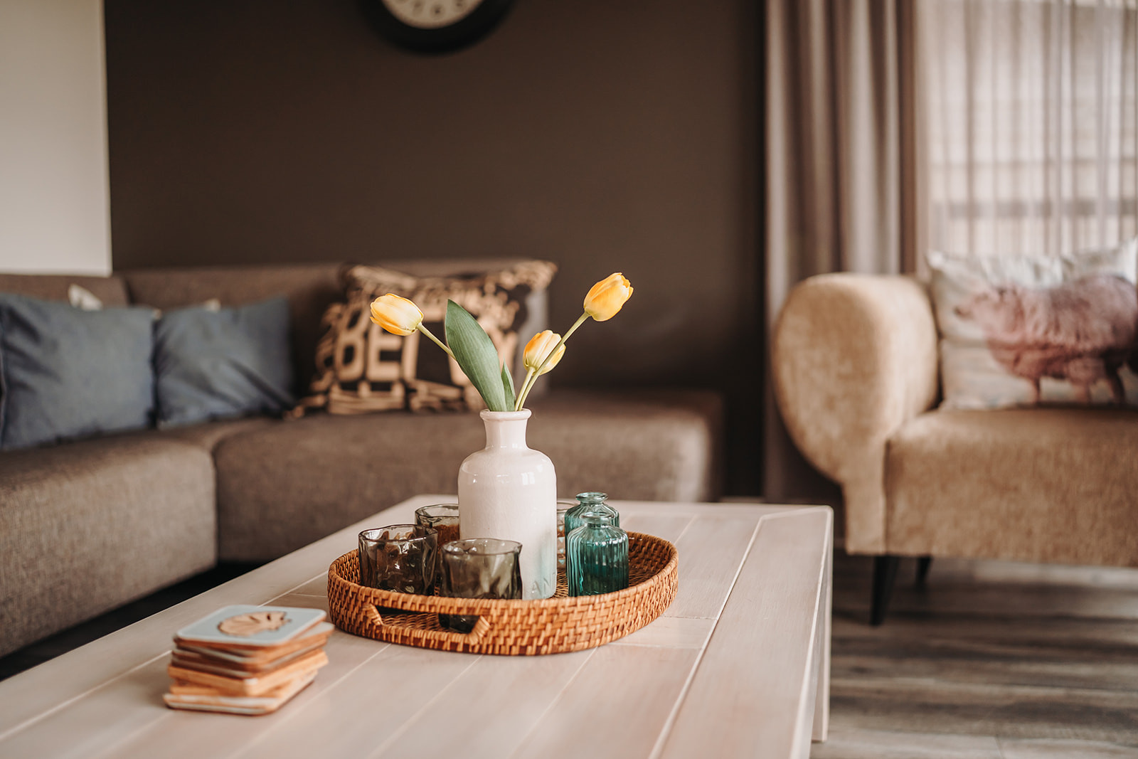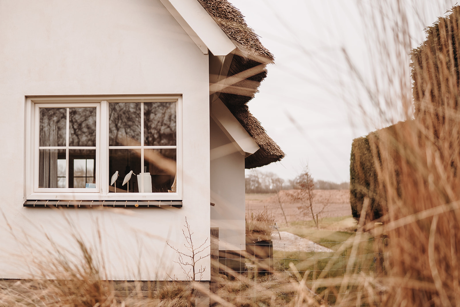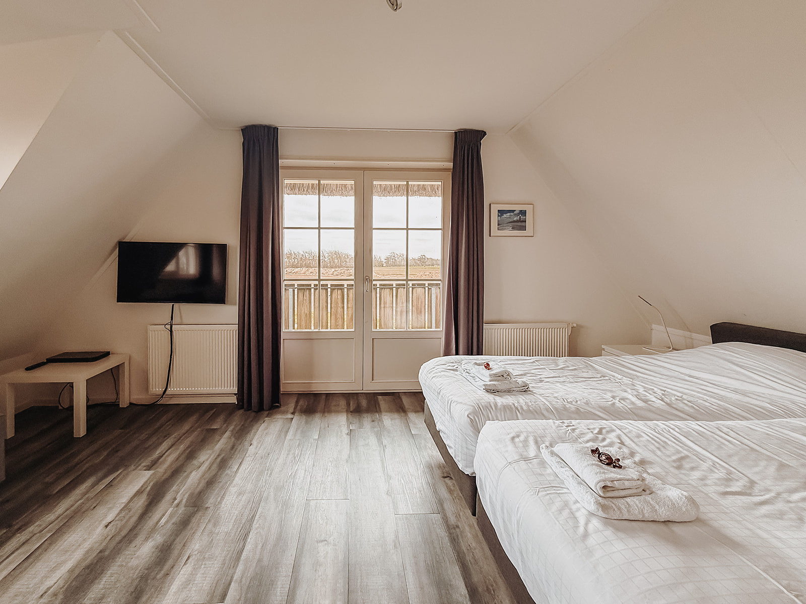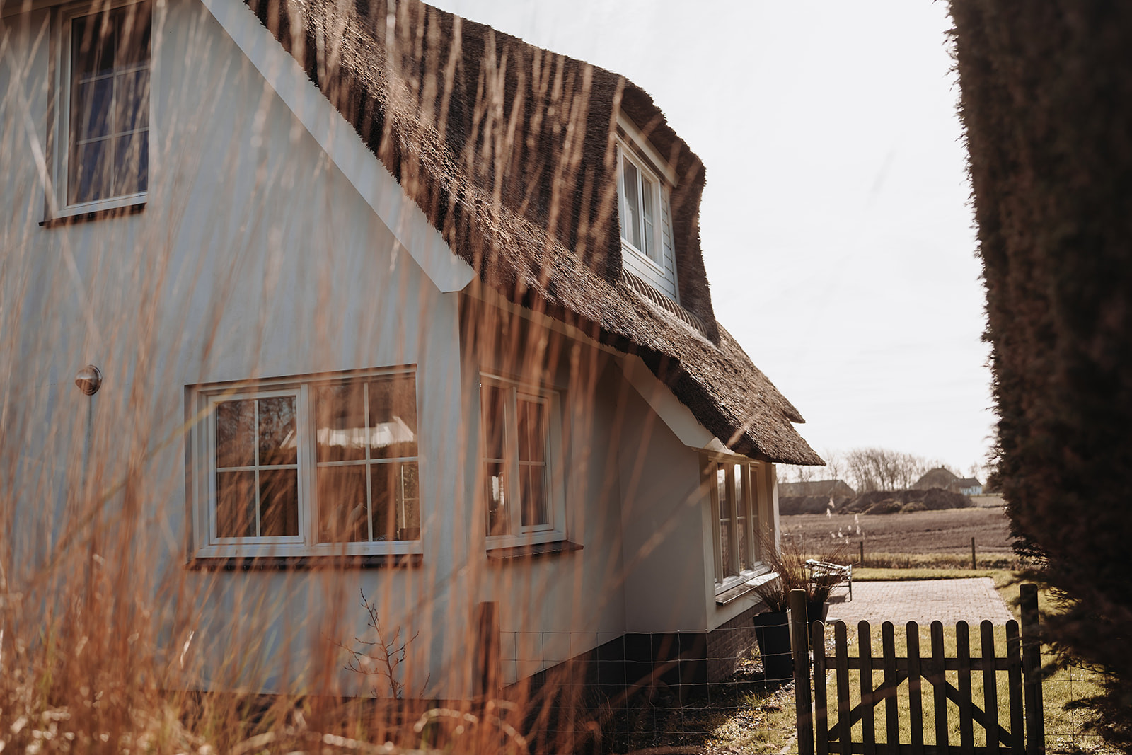 Vanuit de lichte en sfeervolle woonkamer met ruime loungebank heb je een prachtig uitzicht over de landerijen van Texel. Via de openslaande deuren kom je op het terras en in de tuin.