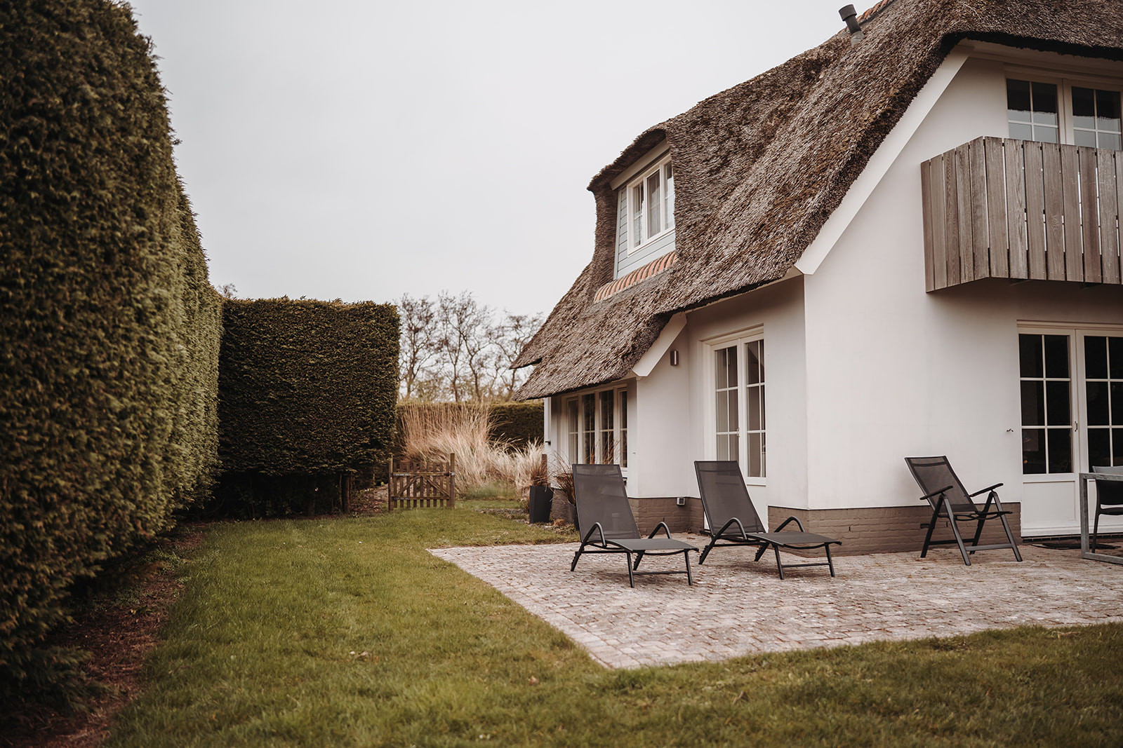 De woning is aan de linker- en rechterzijde afgescheiden met coniferenhagen voor extra privacy. In de voor- en achtertuin vind je gras. In de achtertuin kun je genieten van een ruim terras met een tuintafel, stoelen en een parasol met twee ligbedden. De tuin grenst aan een sloot.
