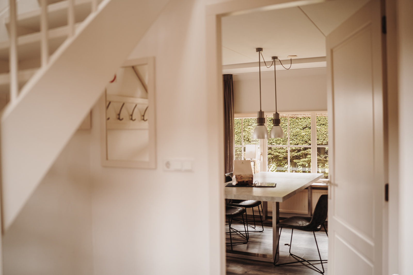 In de woonkamer hangt een Smart-TV (Samsung) en staat een grote eettafel. De open keuken, gelegen aan de voorzijde van de woning, is voorzien van een vaatwasser, koelkast, magnetron, oven, gaskookplaat (5 pits), waterkoker, melkopschuimer, Nespresso-koffiemachine en een (filter) koffiezetapparaat. De wasmachine, droger, stofzuiger en strijkplank met strijkijzer kun je in de naastgelegen bijkeuken vinden. Ook bevindt zich hier een tweede douche en wastafel. In de hal bij de voordeur is een garderobe en een separaat toilet. Via de open trap ga je naar de eerste verdieping.