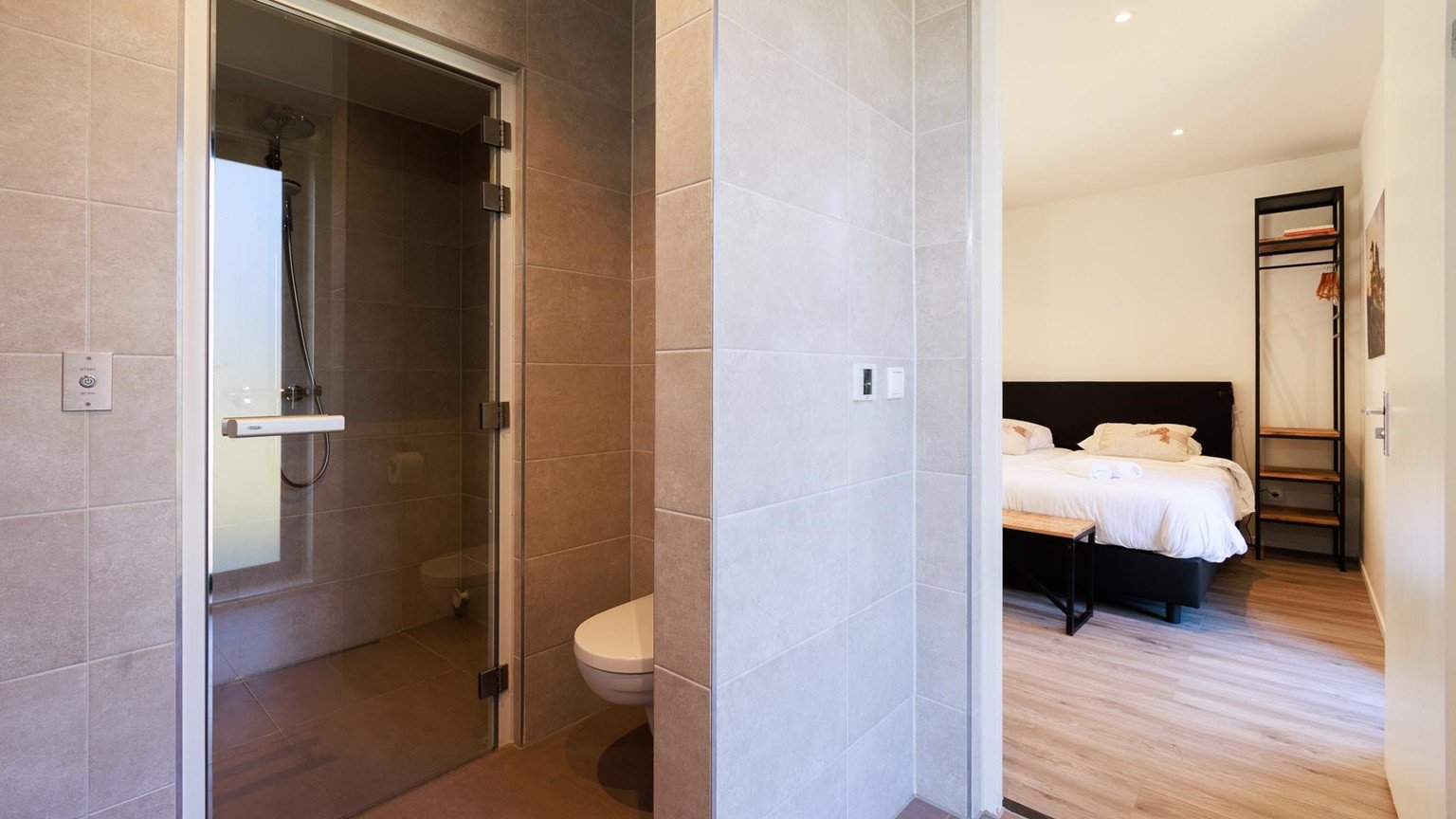 Aan weerszijden van de woonkamer is een ruime slaapkamer, elk met eigen badkamer. Beide slaapkamers kun je openen en afsluiten van de woonkamer. De eerste slaapkamer heeft een tweepersoonsbed, smart TV, douche en apart toilet. In de tweede slaapkamer is naast een tweepersoonsbed, een smart TV en apart toilet ook een heerlijk ruime stoomdouche/sunshower. Ideaal na een wandeling en om even echt tot rust te komen.